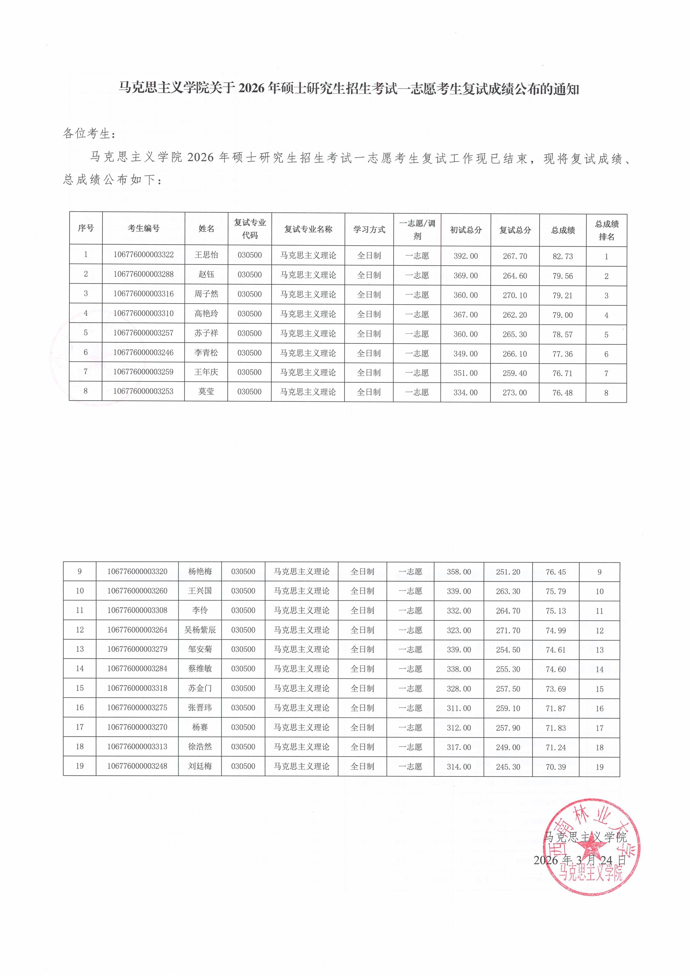 马克思主义学院关于2026年硕士研究生招生考试一志愿考生复试成绩公布的通知
